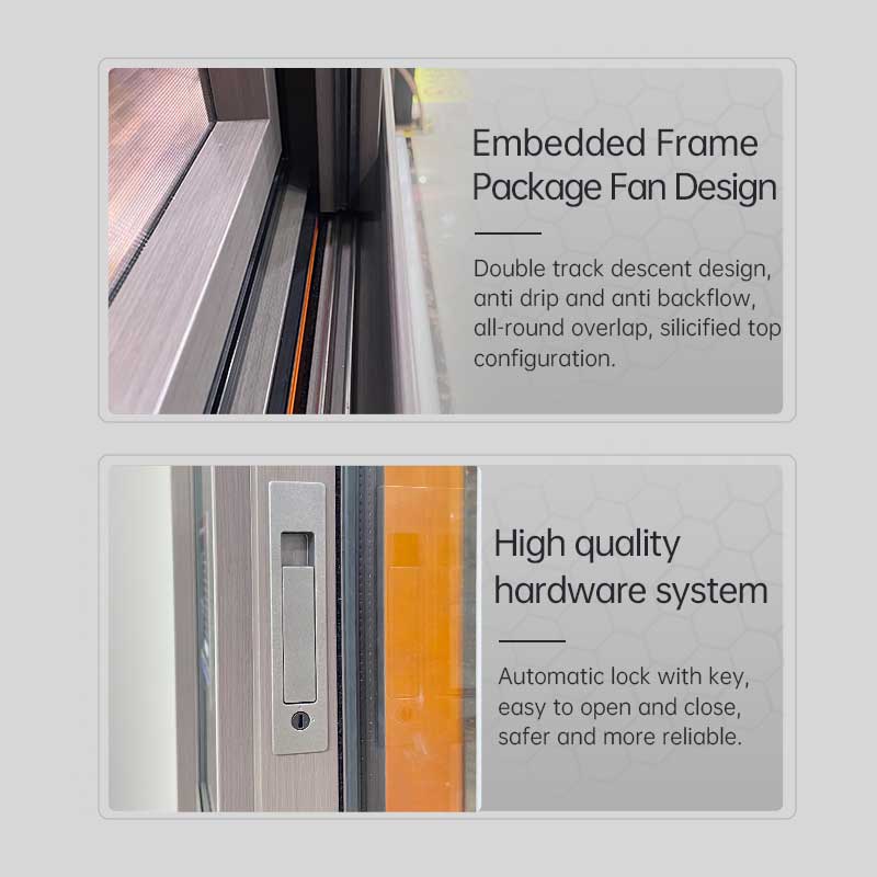 تم تصنيع النوافذ من مواد فاخرة، بما في ذلك سبائك الألومنيوم المصنوعة من السيليكون والتيتانيوم والمغنيسيوم بدرجة 6063 الفضائية مع سمك قياسي يبلغ 1.6 ملم، وتتميز النوافذ بعرض 93 ملم، مما يوفر مقاومة استثنائية لضغط الرياح والتشوه والتزييف. في مواجهة الضغوط الخارجية مثل ضغط الرياح المتزايد، يضمن تصميم الإطار والوشاح المدمج الاستقرار الهيكلي، ويمنع التشوه.