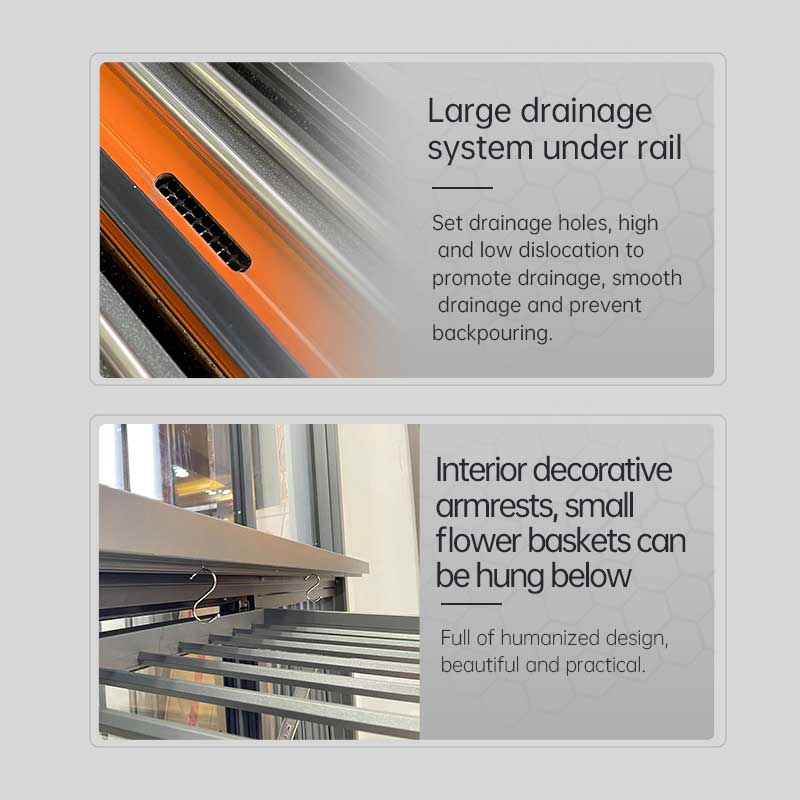 بفضل المقابض المزخرفة المدمجة والحافة السفلية المقاومة للماء، تم تعزيز النوافذ بشكل أكبر لمقاومة الماء ومنع التدفق الخلفي. يمنع نظام الصرف الكبير ذو المسار السفلي بسمك 2.5 مم تسرب المياه وتدفقها الخلفي، ويتميز بفتحات تصريف لتصريف المياه بسلاسة.