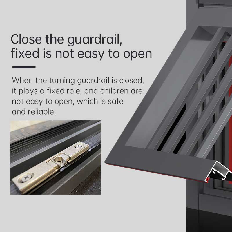 يوفر حاجز الحماية المغلق أمانًا إضافيًا، وعندما يتم إغلاقه، فإنه يعمل كحاجز ثابت، مما يجعل من الصعب على الأطفال فتحه، مما يضمن السلامة. يمكن لخط ضغط السلامة الهيكلية أن يتحمل ضغط الرياح القوي، مع قوة شد وخضوع خمسة أضعاف قوة 50 نافذة عادية، مما يضمن السلامة ضد ضغط الرياح.